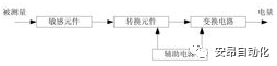 敏感元件直接感受被测量,并输出与被测量有确定关系的物理量信号;转换元件将敏感元件输出的物理量信号转换为电信号;变换电路负责对转换元件输出的电信号进行放大调制;转换元件和变换电路一般还需要辅助电源供电。